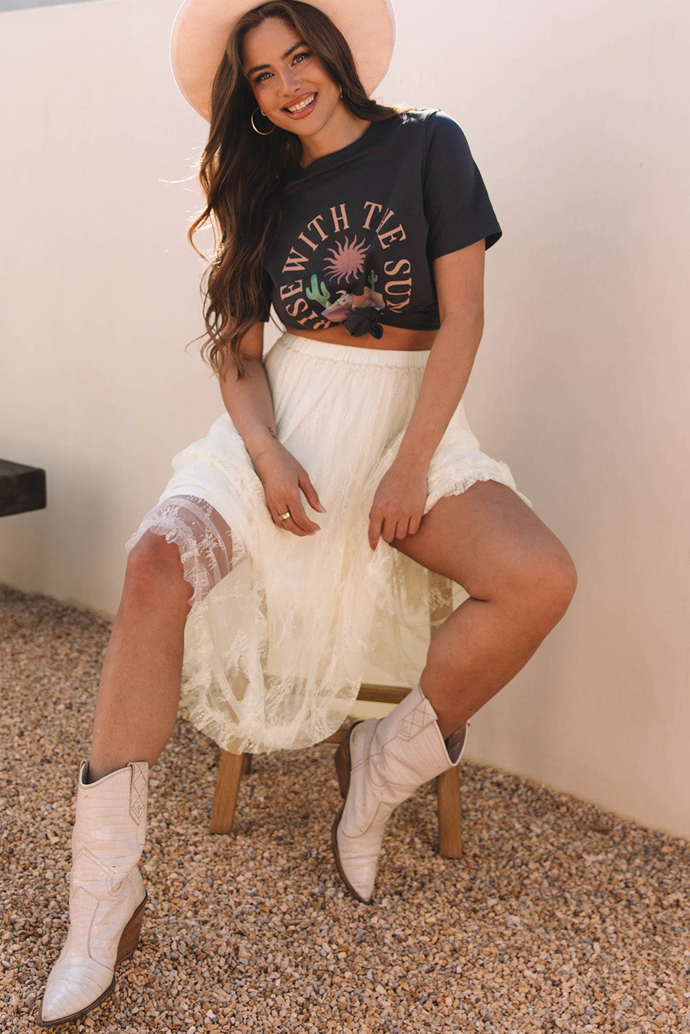 Beige Lace Cascading Tiered High Waist Maxi Skirt