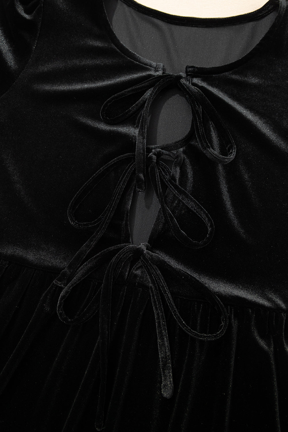Black Front Tie Velvet Bubble Sleeve Mini Dress