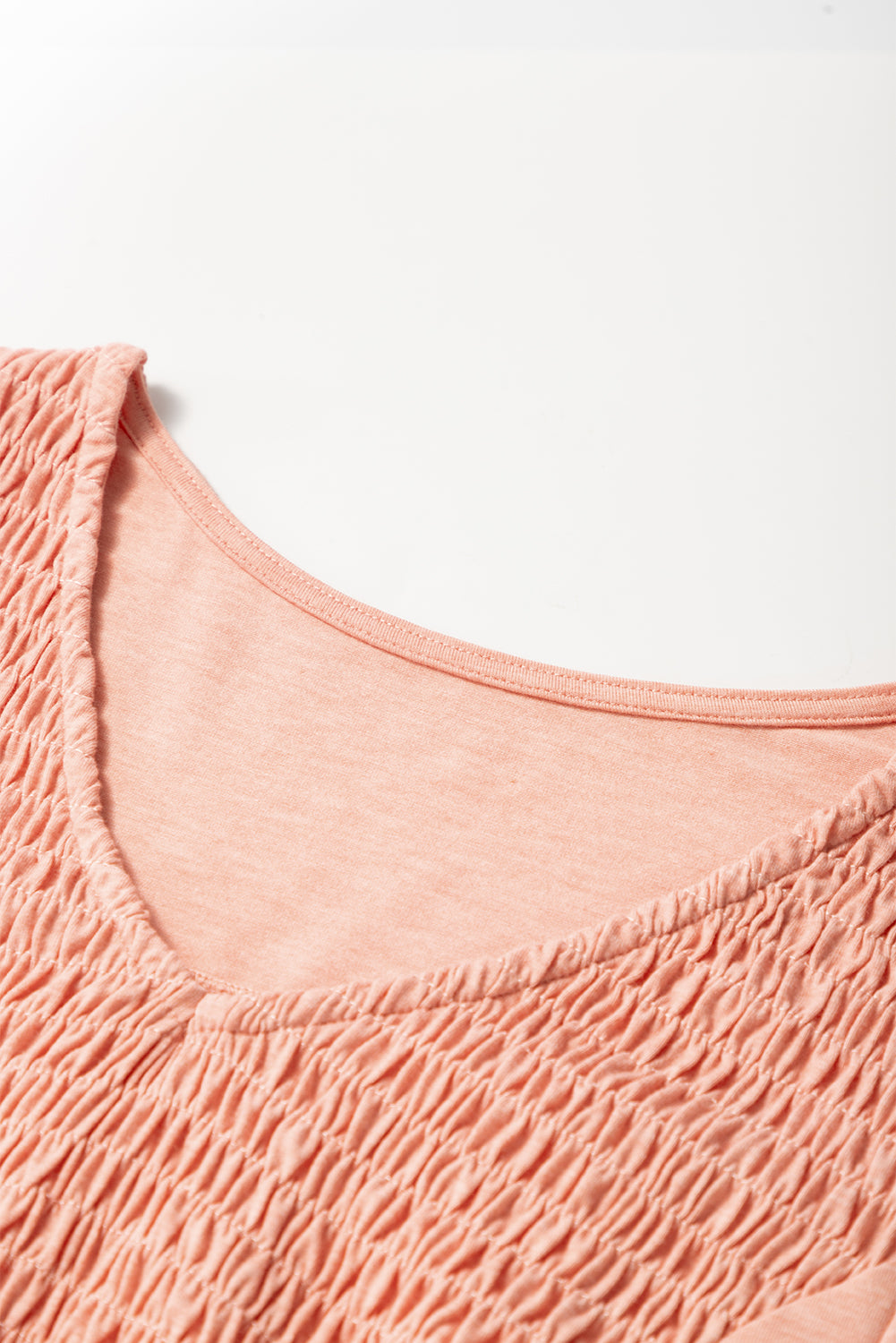 Fushia Smocked Front V Neck Pleated Babydoll Short Sleeve Top