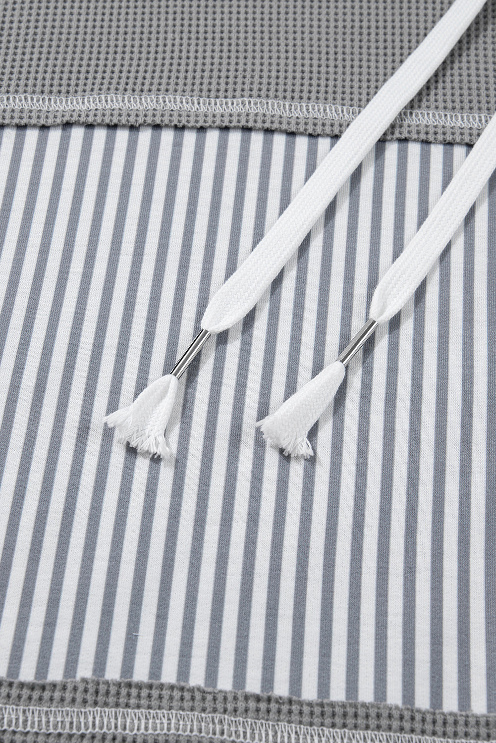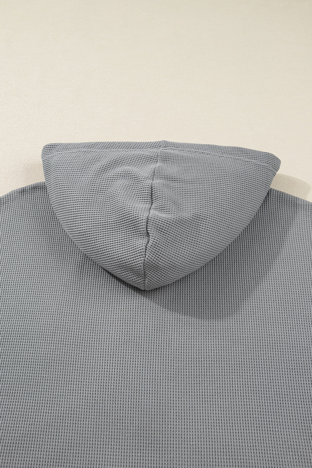 Gray Mixed Pattern Waffle Knit Patchwork Half Buttons Plus Hooded Top