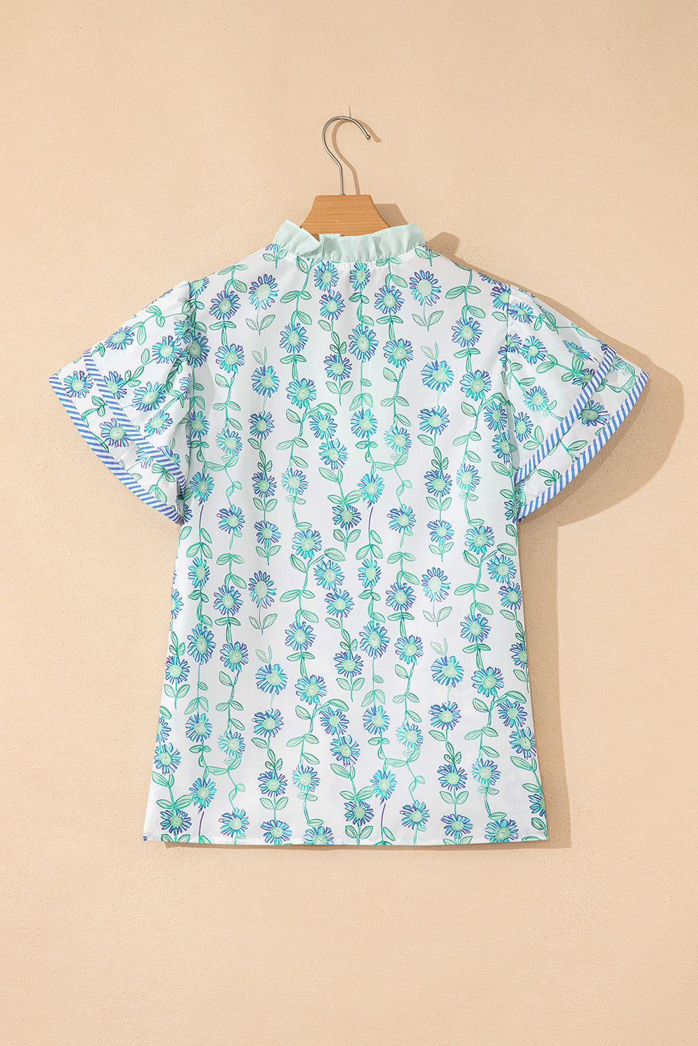 Green Floral Print Striped Detail Contrast V Neck Patchwork Flutter Sleeve Blouse