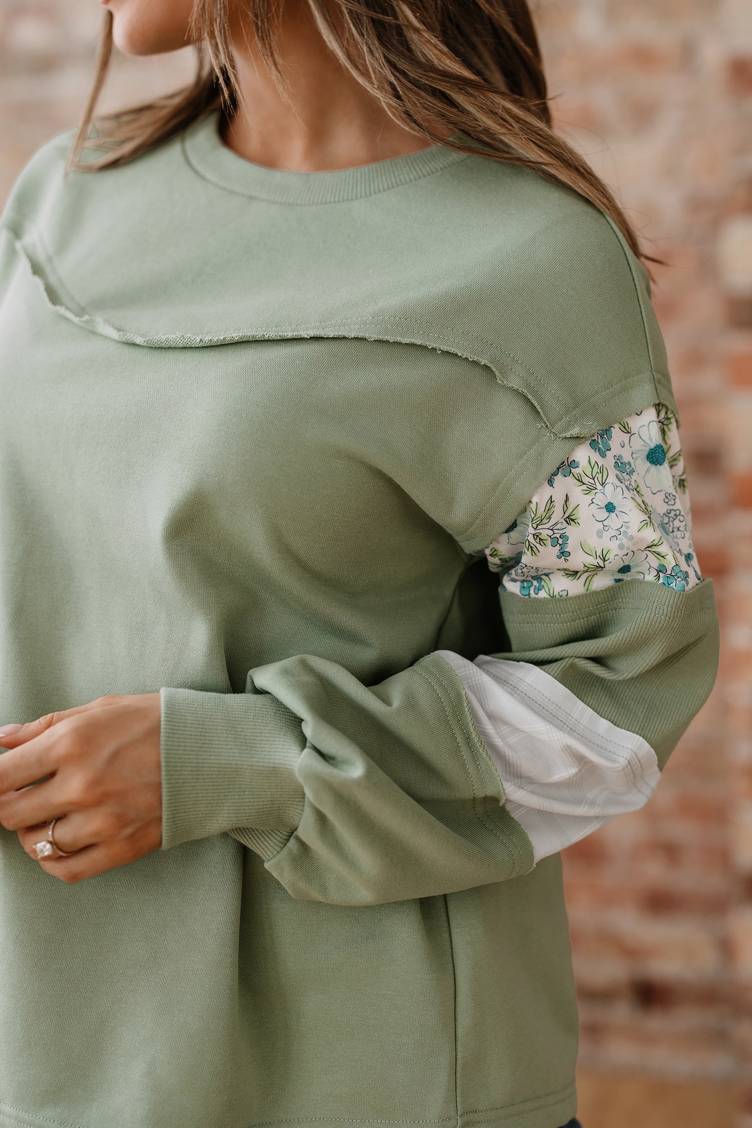 Laurel Green Floral Plaid Mixed Sleeve Raw Edge Relaxed French Terry Top