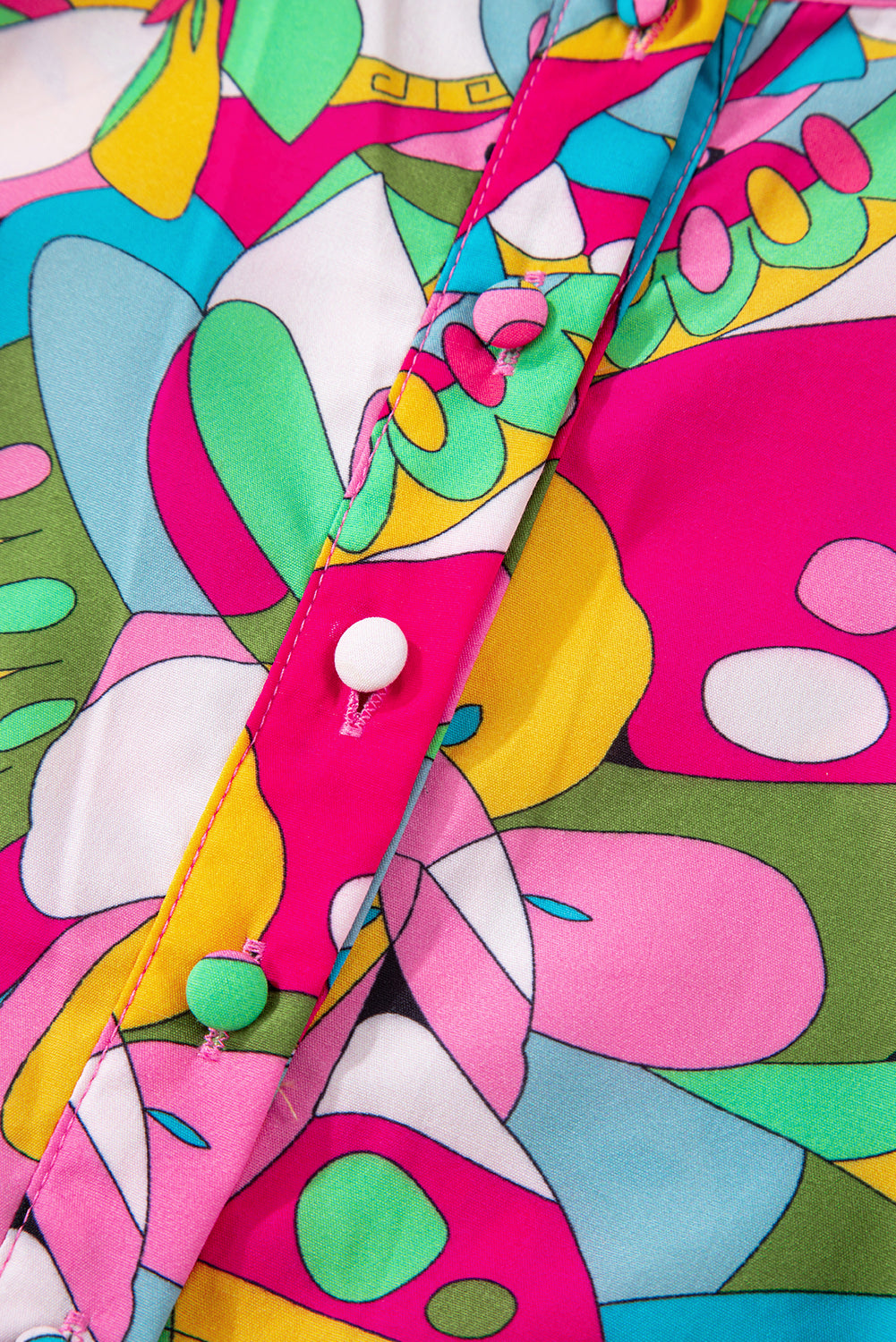 Pink Abstract Printed Lantern Sleeve Buttoned Mini Dress