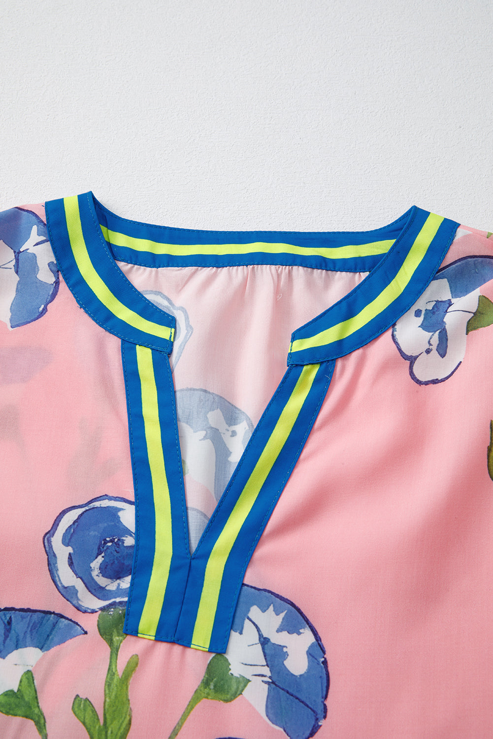 Pink Floral Print Striped Notched V Neck Bubble Sleeve Blouse