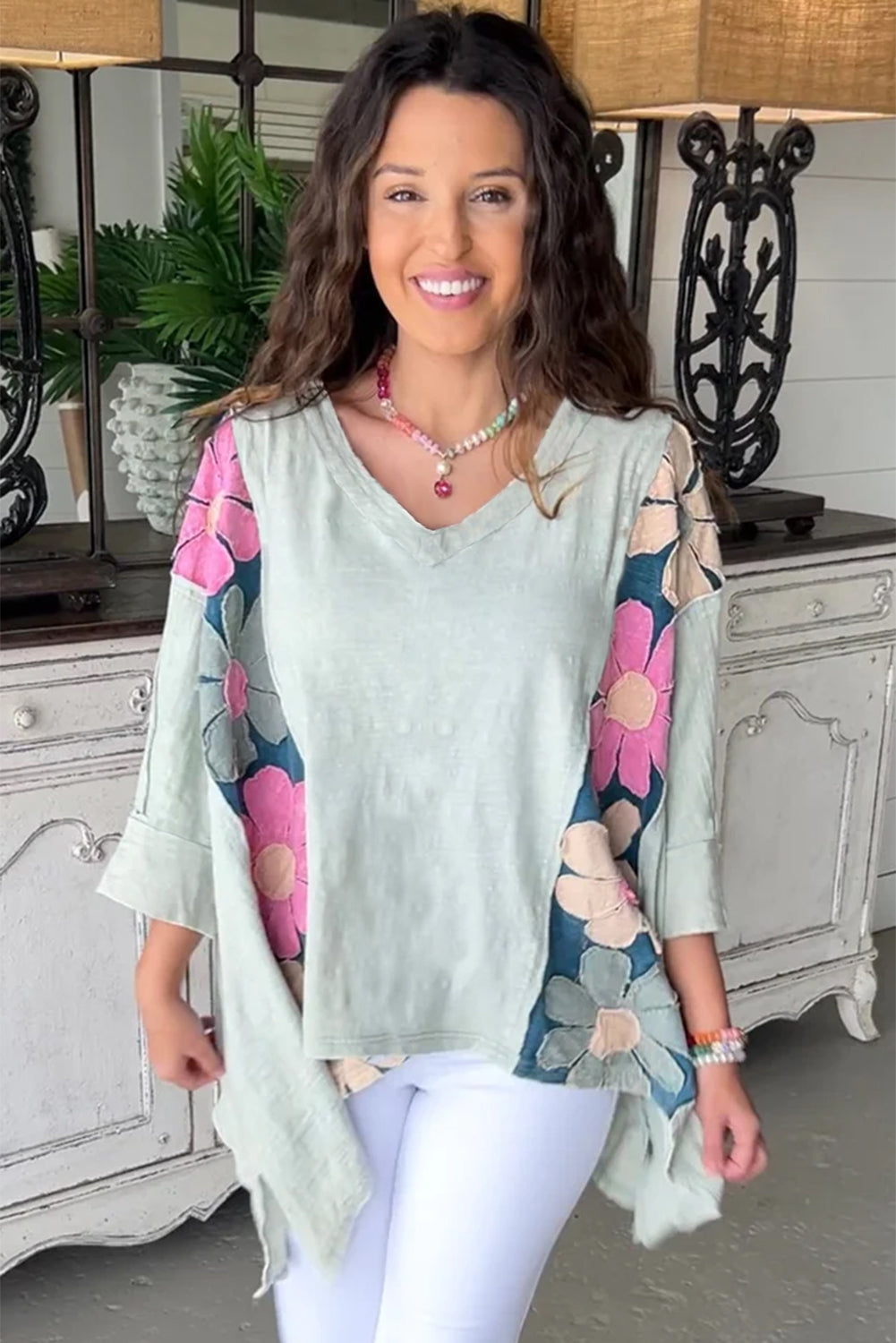 Pink Flower Patchwork Exposed Seam Oversized High Low Top