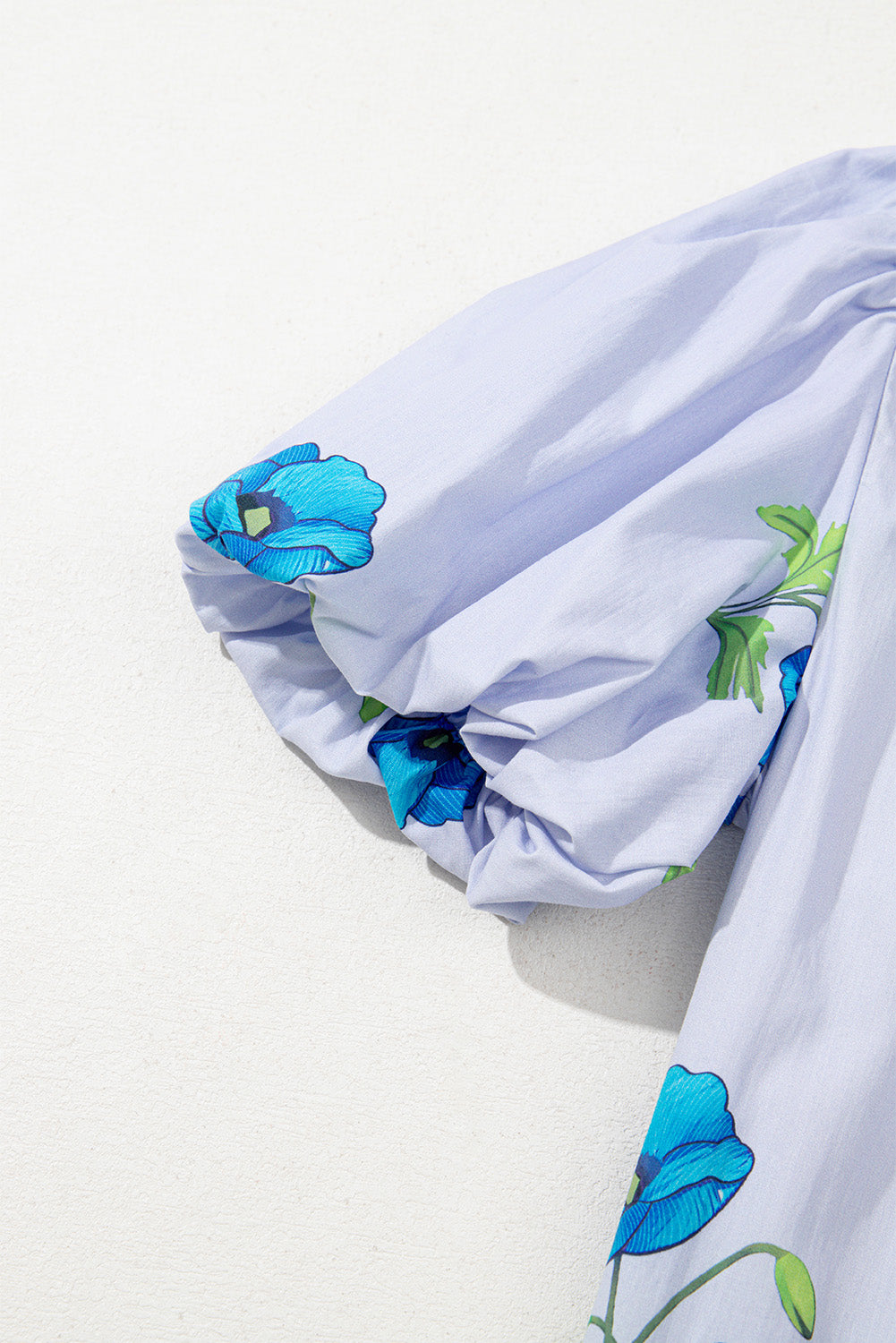 Sky Blue Floral Print Tie Split Neck Short Puff Sleeve Blouse