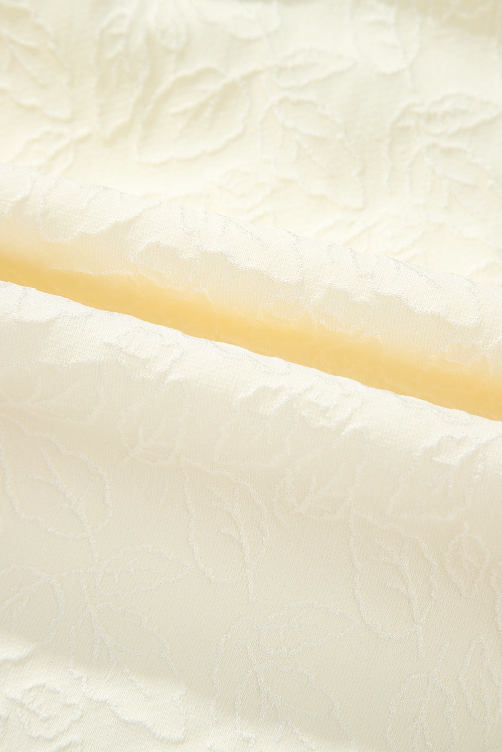 White Floral Textured Bubble Sleeve Frilled Notched Neck Dress