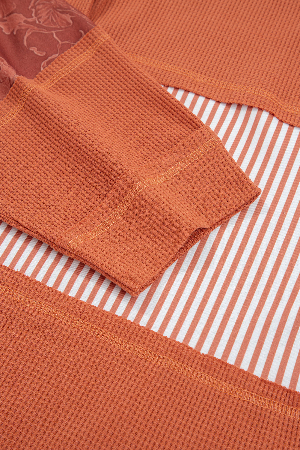 White Waffle Printed Patchwork Drawstring Hooded Long Sleeve Top